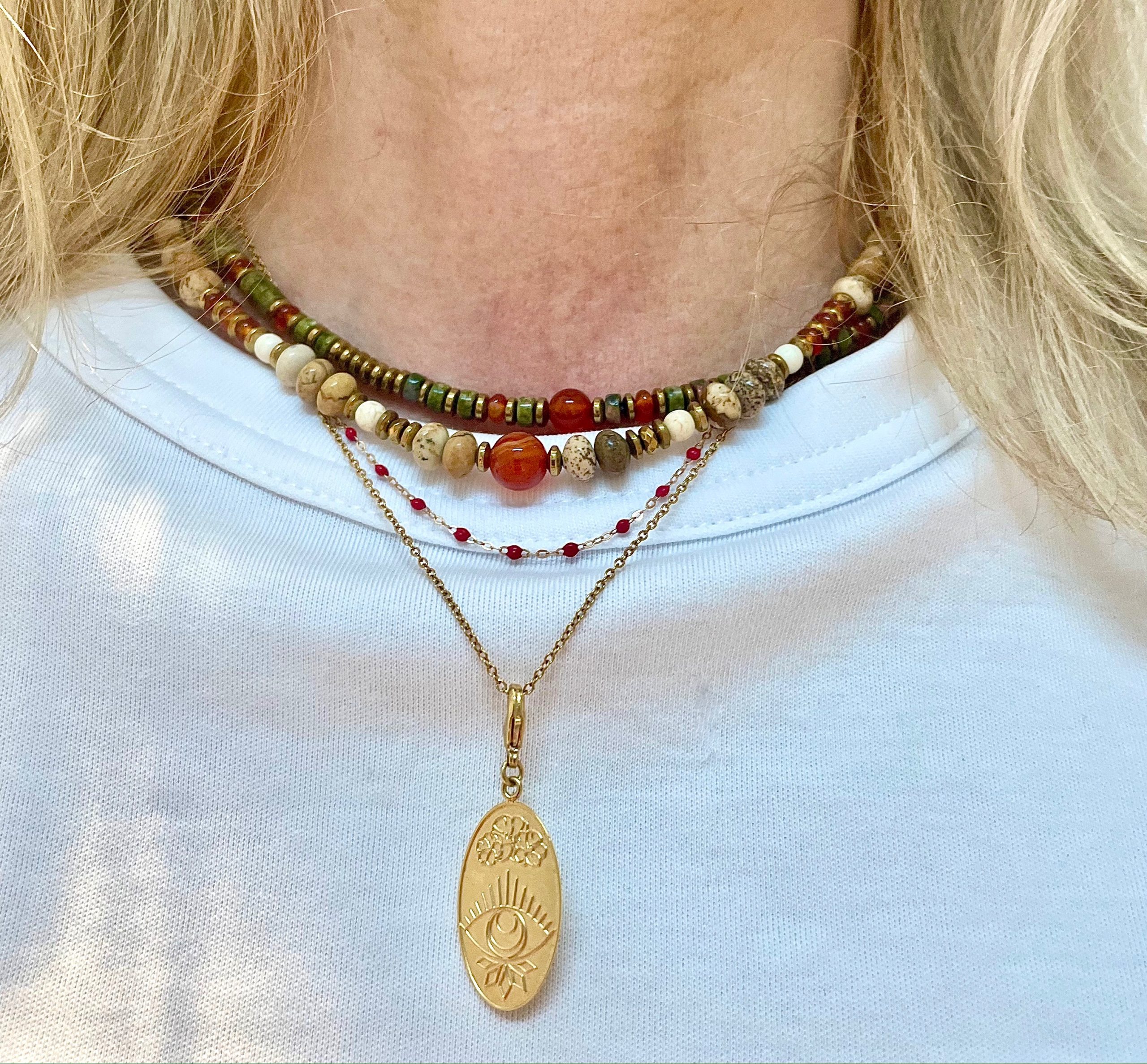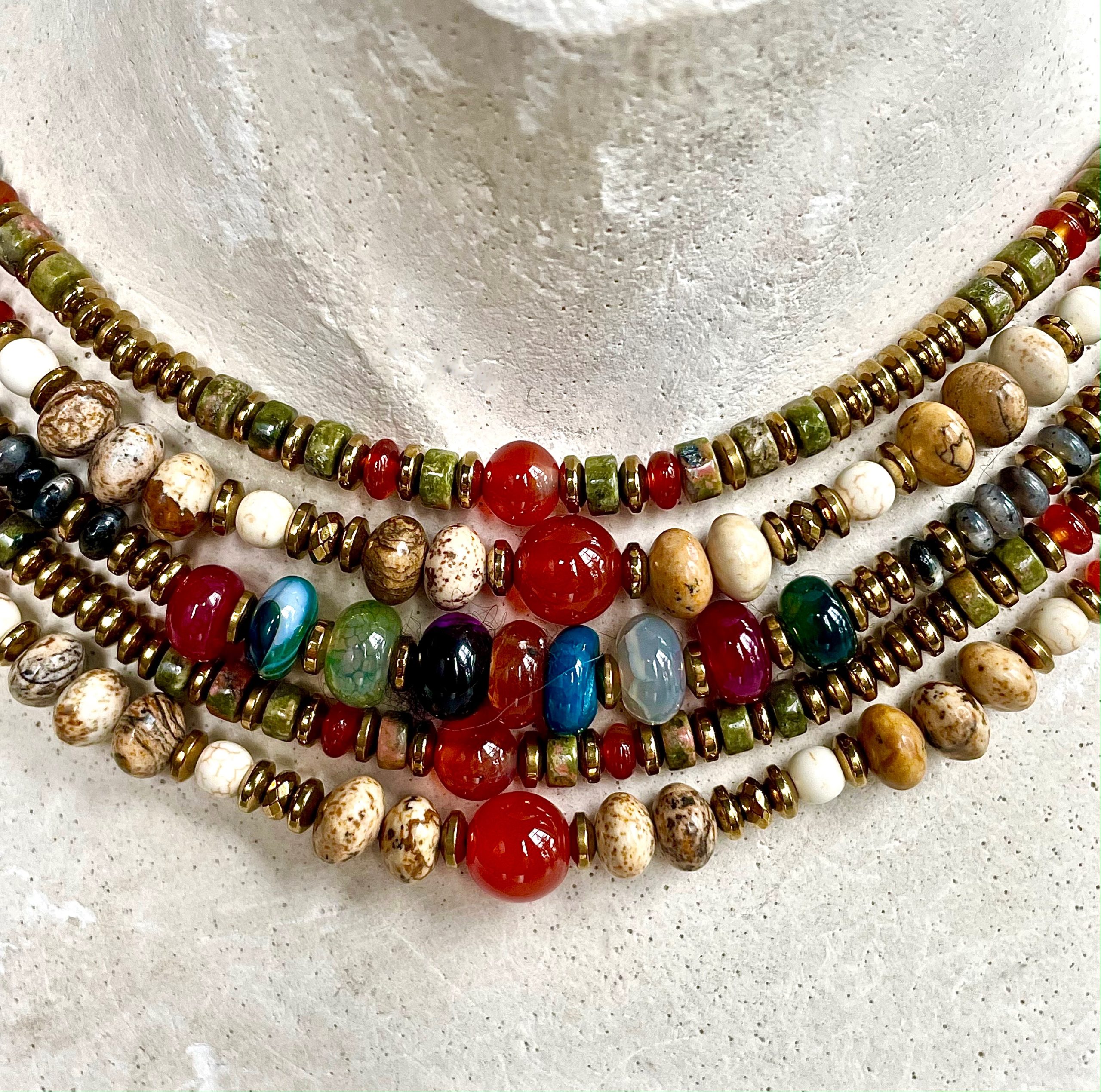 Louise est un collier ras du cou, composé de perles de Jaspe, de Cornalines et d’Hématites.