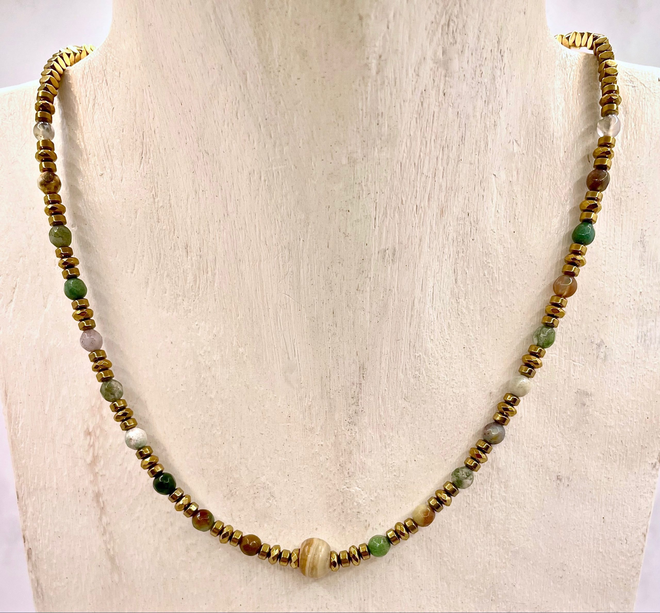Philo est un collier ras du cou, composé d’Agates Indiennes facettées et d’Hématites.