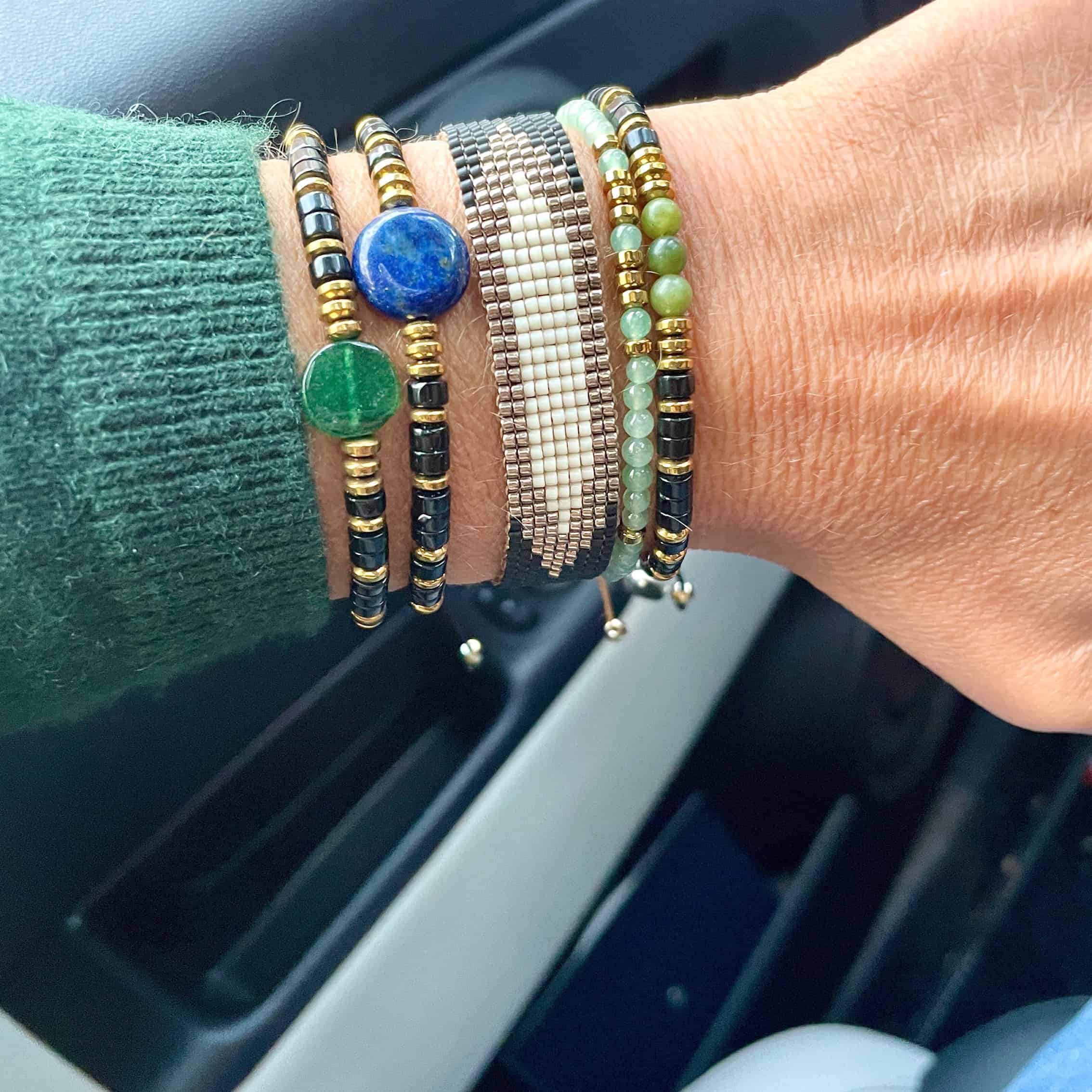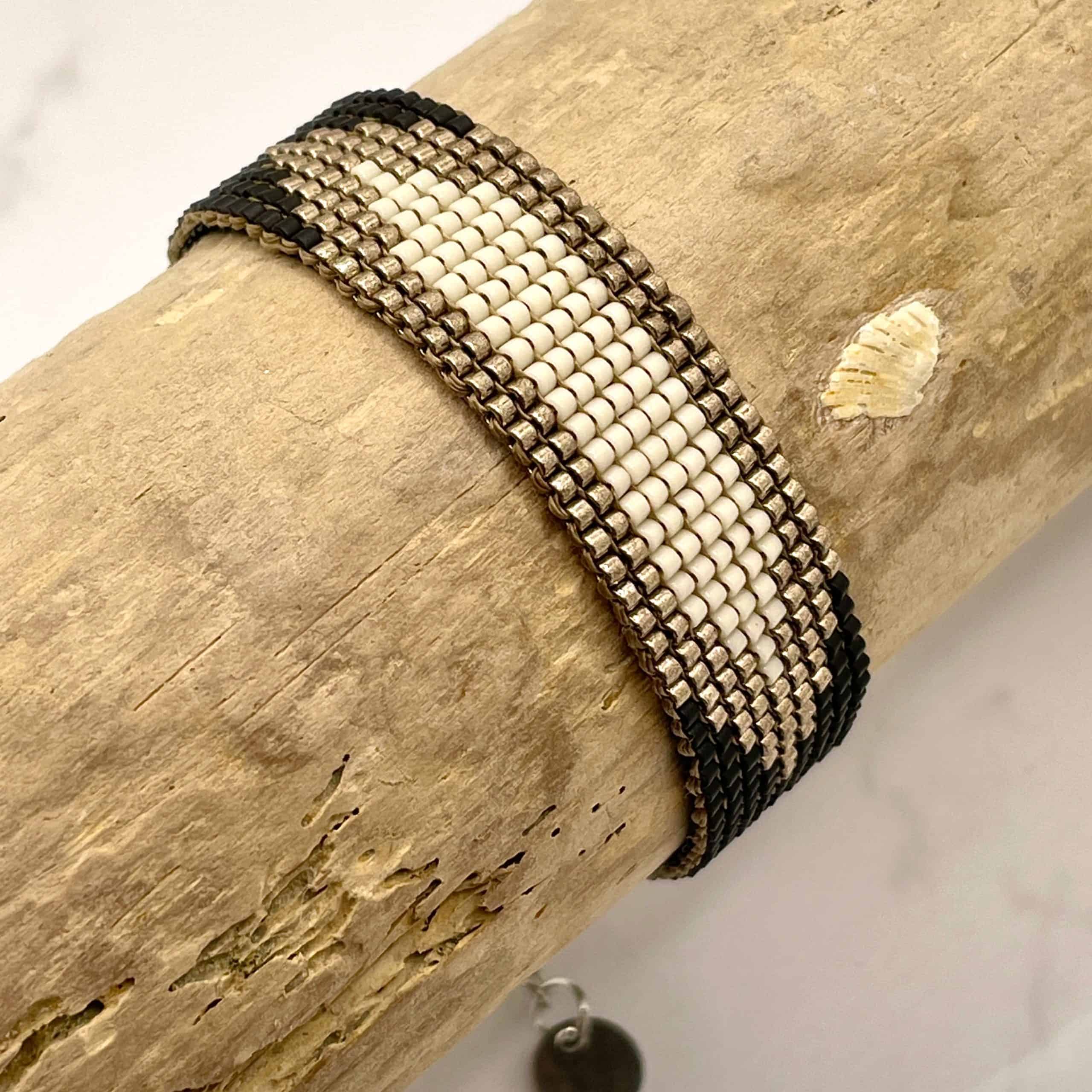 Sam est une manchette entièrement tissée à la main et composée de perles Miyuki. Ces perles en verre sont de grande qualité et très régulières.